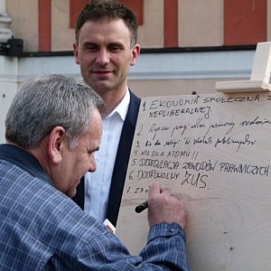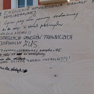 Zachęcali tam przechodniów, aby na drewnianej tablicy wpisywali swoje oczekiwania względem rządu.