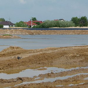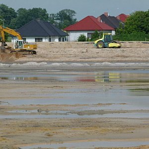 Prace postępują w doskonałym tempie, o czym świadczą dziesiątki ciężarówek, które codziennie wywożą piasek z terenu budowy zbiornika w kierunku budowy trasy S5. Prawie gotowe są już śluzy, którymi woda będzie przechwytywana z Rowu Dąbieckiego, a kiedy nastąpi taka potrzeba spuszczana ze zbiornika z powrotem do tego cieku. Ten łączy się z Rowem Polskim. Dalej, nim woda trafi do Bałtyku, płynie Rowem Śląskim, Baryczą i Odrą.