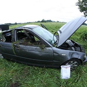 Za Rojęczynem w kierunku Bojanowa mężczyzna prowadzący bmw nie opanował pojazdu i przelatując nad rowem zatrzymał się na polu. Auto nadaje się do kasacji, kierowca leży w szpitalu.