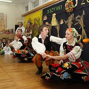 Na początku, tak jak na prawdziwych dożynkach, grupa dzieci i rodziców wręczyła Beacie Lewandowskiej, dyrektorce placówki, wieniec dożynkowy, bochen chleba i kosz pełen owocow i warzyw.