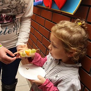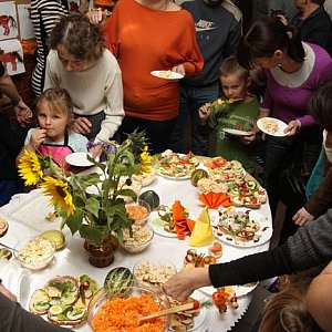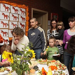 Każda z grup miała za zadanie przygotować inną potrawę. Krasnale - sałatkę jarzynową, Misie - owocowe szaszłyki, Biedronki - surówki, a Motylki - zdrowe kanapki. Mając do dyspozycji różne warzywa i owoce, wszyscy ochoczo przystąpili do realizacji swoich zadań. Najbardziej przejęci byli najmłodsi uczestnicy warsztatów, którzy wspólnie z rodzicami ścierali, kroili i obierali owoce oraz warzywa. Z biegiem czasu talerze zapełniały się kolorowymi kanapkami, sałatkami i owocowymi szaszłykami. Końcowy efekt warsztatów można było podziwiać na stołach przyozdobionych kwiatami jesieni. Zanim to wszystko zostało skonsumowane, wszyscy robili sobie przy zdrowej wystawie pamiątkowe zdjecia.