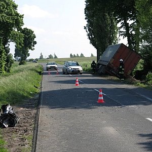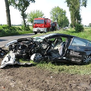 Honda na skutek zderzenia czołowo-bocznego odbiła się od TIR-a i wypadła z drogi na pobocze. Kierujący został zabrany do szpitala, wcześniej z samochodu uwolnili go strażacy.