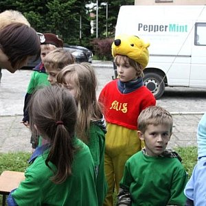 Na placu zabaw przed budynkiem przedszkola zebrały się wszystkie grupy przedszkolaków ze swoimi rodzicami. Każda grupa reprezentowała inną służbę mundurową. Biedronki - straż pożarną, dlatego w ich ubiorze dominował kolor czerwony. Na biało ubrane były Motylki, bo reprezentowały służby medyczne. Pszczółki wystąpiły w kolorze czarnym, w jakim są mundury Straży Miejskiej, policję reprezentowali Kubusie, dlatego w ich ubiorze przeważał kolor niebieski. A Zajączki wystąpiły w roli żółnierzy, dlatego bawiły się na pikniku w kolorze zielonym.