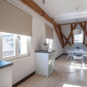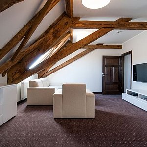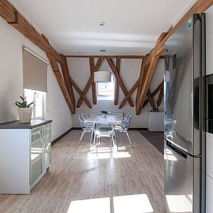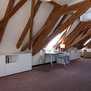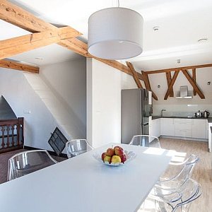 - Zachowaliśmy wiele elementów dawnej budowli - mówi Jędrzej Quoos, menadżer holetu. Oryginalne są np. fragment posadzki w holu, poręcz na schodach, drzwi wejściowe. Do apartamentu wchodzi się przez komin, w środku podziwiać można przepięknie zakonserwową więźbę dachową.