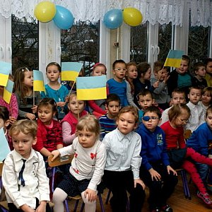 Przedszkolaki z grup: Smerfy, Krasnale, Biedronki, Motylki i Zające oklaskiwały występ kwartetu męskiego śpiewającego na cztery głosy popularne ukraińskie melodie ludowe.