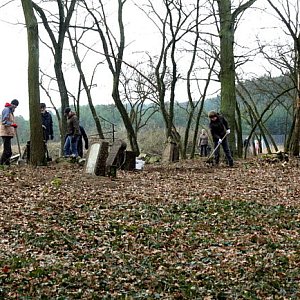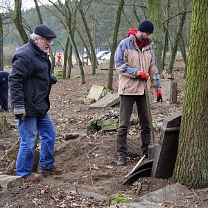 Dziś teren jest sprzątany z zalegających warstw ziemi i liści. Ludzie podnoszą z ziemi leżące nagrobki i stawiają je pionowo. Najmłodsi uczestnicy akcji to Julia i Jakub.