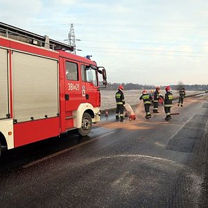 Wszystko wskazuje, że na skutek uderzenia w dużego psa doszło dziś rano do uszkodzenia przewodów paliwowych w samochodzie ciężarowym, a w następstwie wycieku na trasie pomiędzy Osieczną w Lesznem.