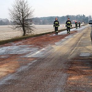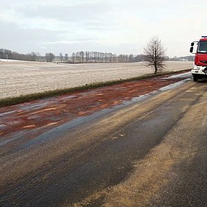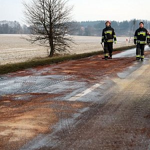 Olej napędowy wypłynął w pobliżu Trzebani, ale samochody rozniosły go jeszcze dalej. Jezdnię sprząta straż pożarna, paliwo jest zbierane z jezdni, a asfalt dodatkowo posypywany piaskiem. Kierowcy muszą korzystać z objazdu przez Kąkolewo i Łoniewo.
