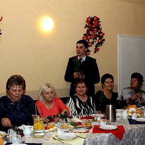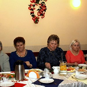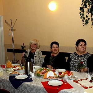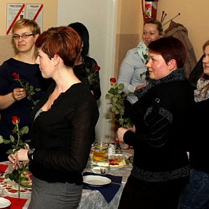 Przy dźwiękach "Sto lat" panowie z Rady Sołeckiej wręczyli każdej z pań czerwoną różę. Oni też wcielili się w rolę kelnerów i donosili do stołów smaczne potrawy. Był również wspaniały tort, ufundowany przez radnego Mateusza Stachowskiego.