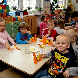 wykonywały z kolorowego papieru kurczątka, kurki i koguciki, które ozdobią domowy wielkanocny stół.