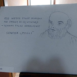 Uczestnicy pleneru sięgali również po poważniejsze tytuły. Ewa Pogoreło poświęciła swoją pracę Senece i jego "Myślom". Rysunku dopełnił cytat "Kto wiedzie żywot spokojny, nie znaczy, że się wywinął - uzyskał tylko odroczenie".