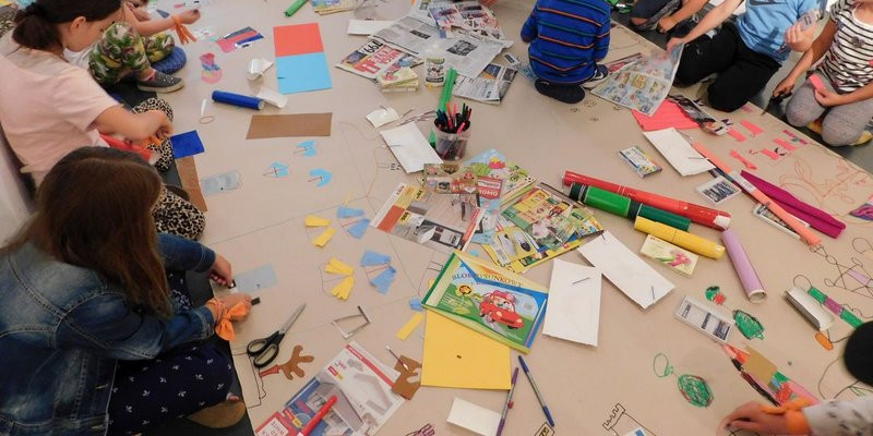 Do programu dzisiejszych zajęć wpisano zabawy plastyczne w Galerii MBWA przy ulicy Leszczyńskich. Dzieci tworzyły dużą, wspólną pracę. Wykorzystywały do tego kredki, pisaki, gazety, kolorowe bibuły i papier.