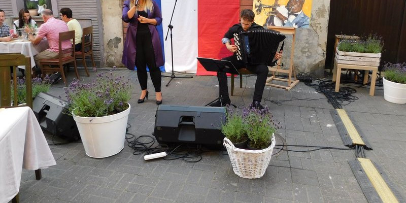 Goście raczyli się francuskimi specjałami rozmawiając i słuchając na żywo koncertu piosenek francuskich.