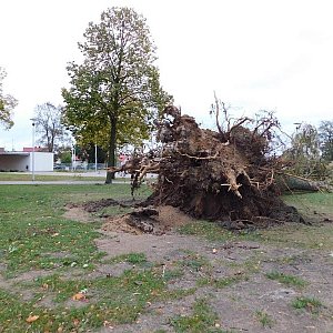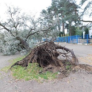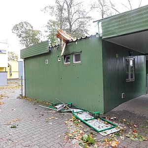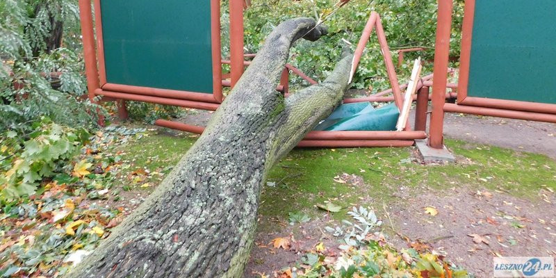 Powalone drzewa, uszkodzony dach budynku socjalnego, połamane ogrodzenia i tablice na ścieżce edukacyjnej oraz uszkodzone kostki na alejkach to straty jakie spowodował silny wiatr, który wczoraj wieczorem zaczął wiać w Lesznie.
