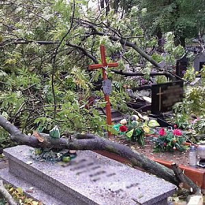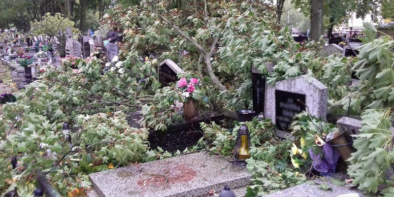 Na cmentarzu przy ul. Kąkolewskiej w Lesznie wichura wyrządziała duże szkody. Niektóre nagrobki zostały całkowicie zniszczone. Wszędzie leżą połamane gałęzie i potłuczone znicze.