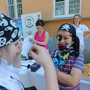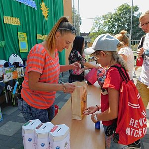 Na boisku przy szkole mnóstwo się dzieje. Są stoiska z ciastami i domowymi przetworami, co jest zasługą rodziców. Są stoiska, przy których można sprawdzić znajomość tabliczki mnożenia czy pogłówkować przy grze w warcaby. Klasy zadbały o program artystyczny. Można skorzystać z usług salonu piękności czy zmienić fryzurę, a nawet kolor włosów.