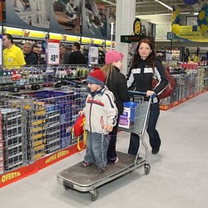 Po pół godzinie obszerny parking przed marketem zapełnił się samochodami. Najczęściej wkładano do nich, zakupione panele podłogowe i drzwi.