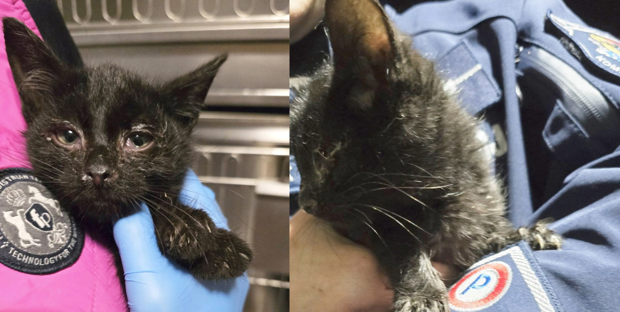 W pewnym momencie do ich radiowozu podbiegło bardzo zaniedbane małe kocię. Miało tak zaropiałe oczy, że prawie nic nie widziało.