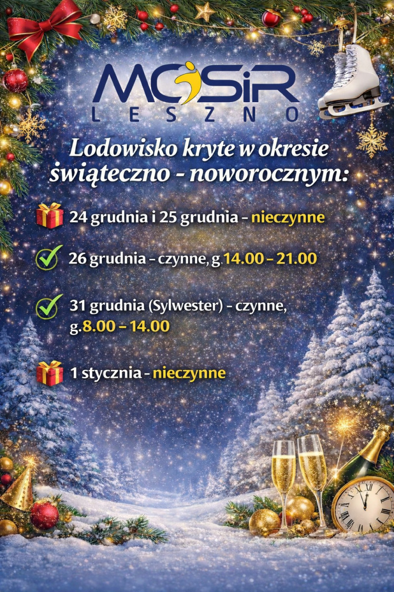W Święta Bożego Narodzenia można wybrać się na łyżwy. W końcówce grudnia lodowisko w Lesznie będzie jednak zamknięte w Wigilię, 24 grudnia i w Nowy Rok, 1 stycznia.