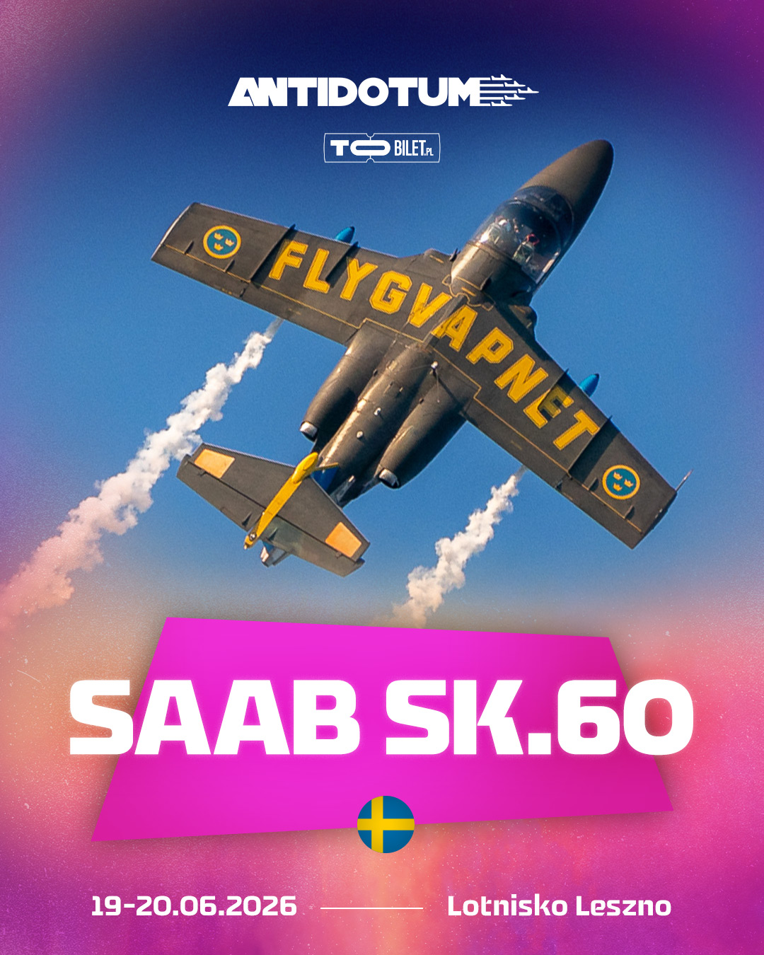 Spółka Lotnisko Leszno co kilka dni odkrywa nowe karty związane z tegorocznym Antidotum AirShow. Tym razem przedstawia kolejnego odrzutowca, która pojawi się na leszczyńskim niebie 19 i 20 czerwca 2026 roku. To Saab SK.60.
