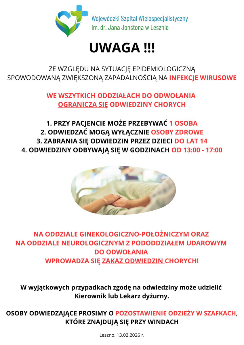 Wojewódzki Szpital Wielospecjalistyczny w Lesznie wydał nowy komunikat dotyczący odwiedzin pacjentów.