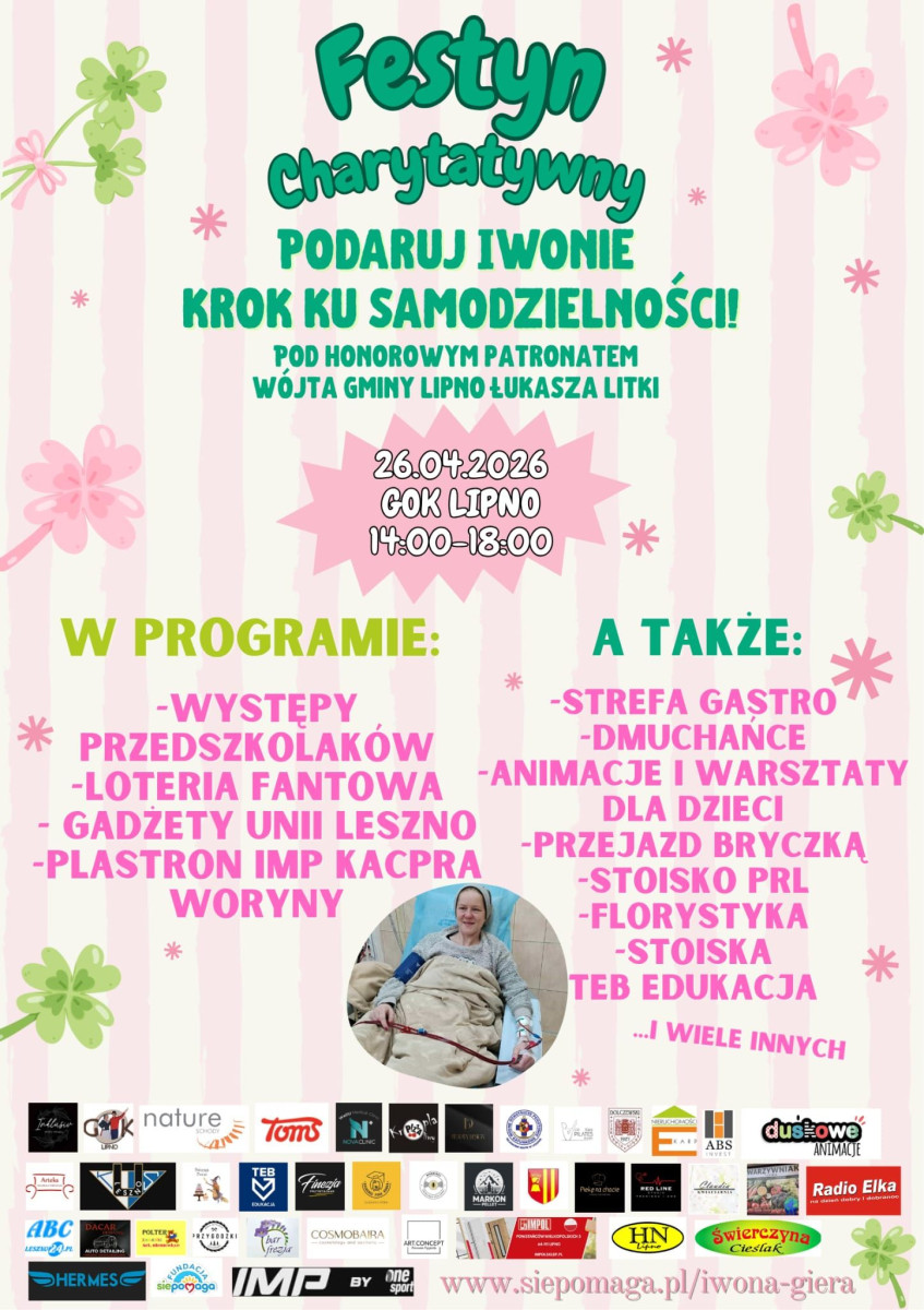 Natomiast w niedzielę, 26 kwietnia w Gminnym Ośrodku Kultury w Lipnie odbędzie się festyn charytatywny "Podaruj Iwonie krok ku samodzielności".
