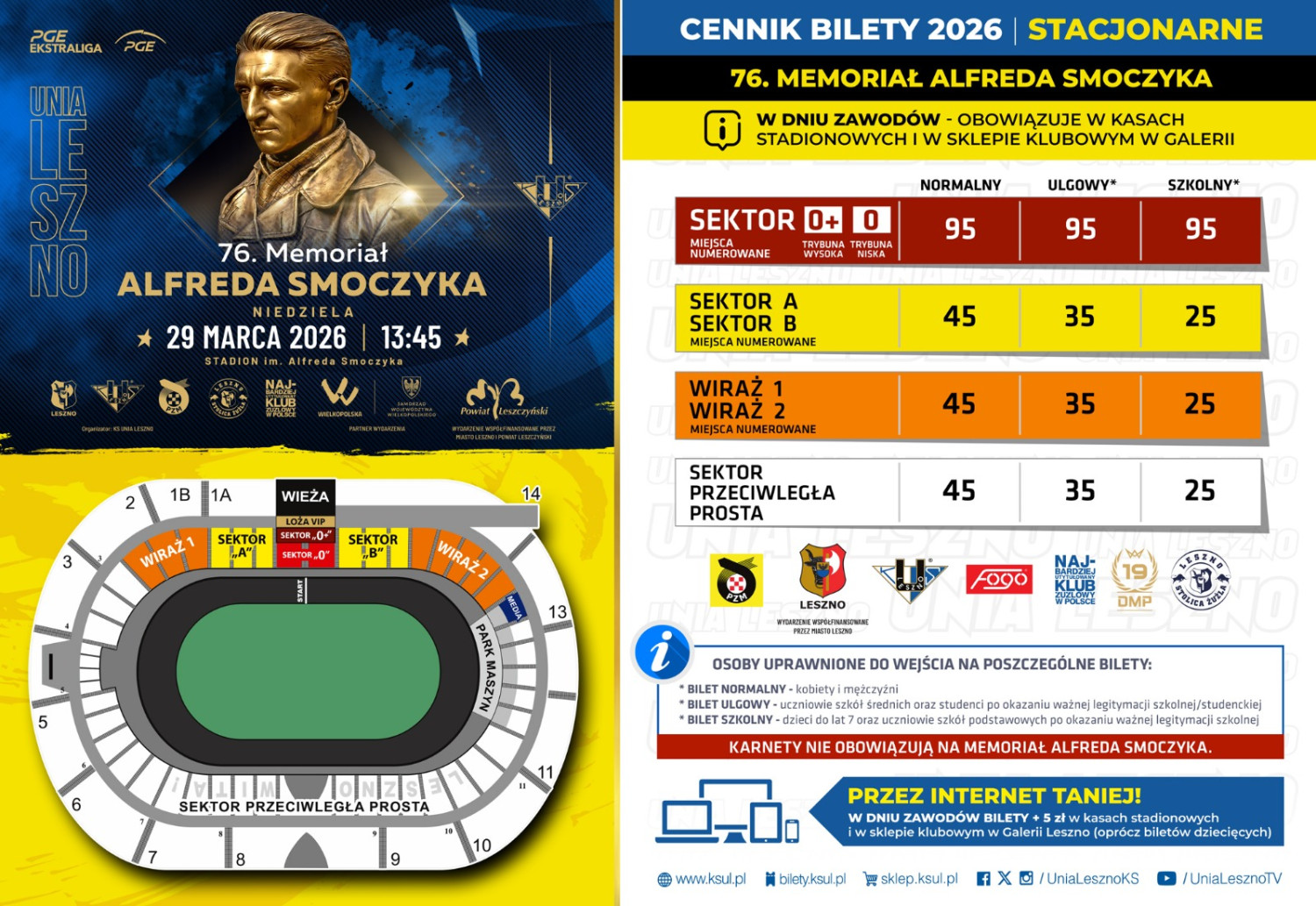 UWAGA! W dniu zawodów, w kasach przy stadionie oraz w sklepie klubowym w Galerii Leszno bilety będą droższe o 5 złotych (oprócz biletów dziecięcych)