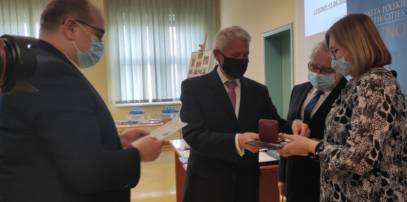 Wiceprezydent Adam Mytych i przewodniczący Rady Miejskiej Tomasz Malepszy, w imieniu samorządu, wręczyli prezesowi Lechowi Woźnemu tytuł Zasłużony dla Miasta Leszna.