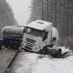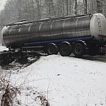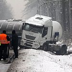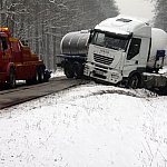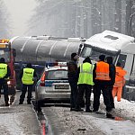 Kolizja na zaśnieżonej drodze pomiędzy Leszem a Kąkolewem. W okolicach przejazdu kolejowego do rowu wpadł TIR. Wcześniej zahaczył o volkswagena passata.
