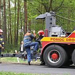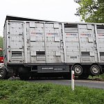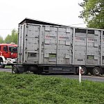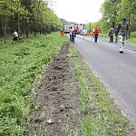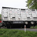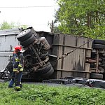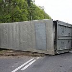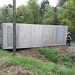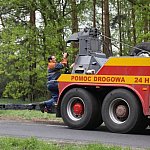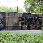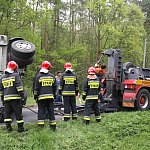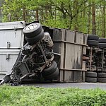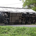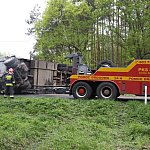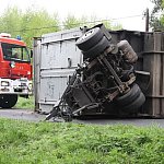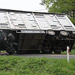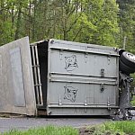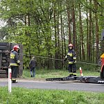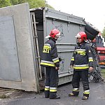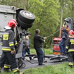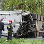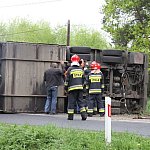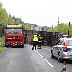 Przyczepa samochodu ciężarowego podczas wyprzedzania autobusu złapała pobocze w wyniku czego zestaw wpadł do rowu. Jedna nitka drogi jest już przejezdna.