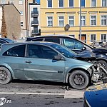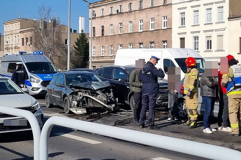 Na zjeździe przed sygnalizacją świetlną zderzyło się 5 aut osobowych, w których było 8 osób. Jedna z nich została przewieziona do szpitala na bardziej szczegółowe przebadanie.