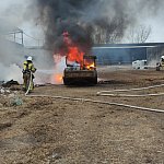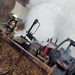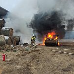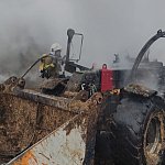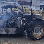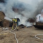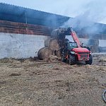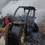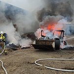 Niemal doszczętnie spaliła się ładowarka teleskopowa stojąca na placu manewrowym. Ogień przeniósł się na znajdujące się w pobliżu baloty słomy.