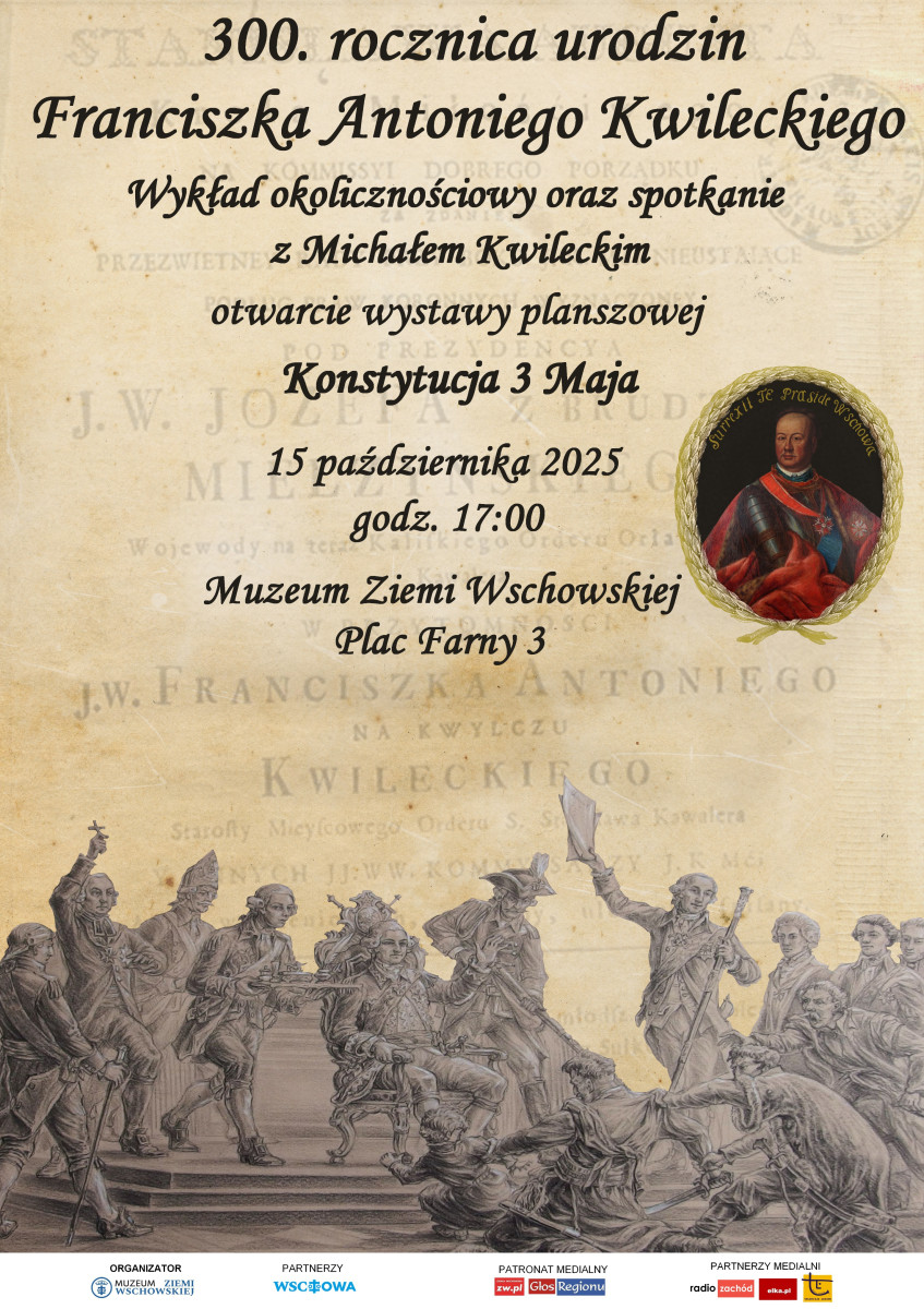 15 października o godz. 17 w Muzeum Ziemi Wschowskiej przy pl. Farnym 3 odbędzie się wykład upamiętniający przypadającą tego dnia 300. rocznicę urodzin Franciszka Antoniego Kwileckiego, zwolennika reform, sygnatariusza Konstytucji 3 Maja, piastującego przez 30 lat urząd starosty wschowskiego. Podczas spotkania odbędzie się rozmowa z Michałem Kwileckim, kanclerzem Stowarzyszenia Potomków Sejmu Wielkiego, który opowie o swoich przodkach, uchylając rąbka tajemnic rodzinnych.