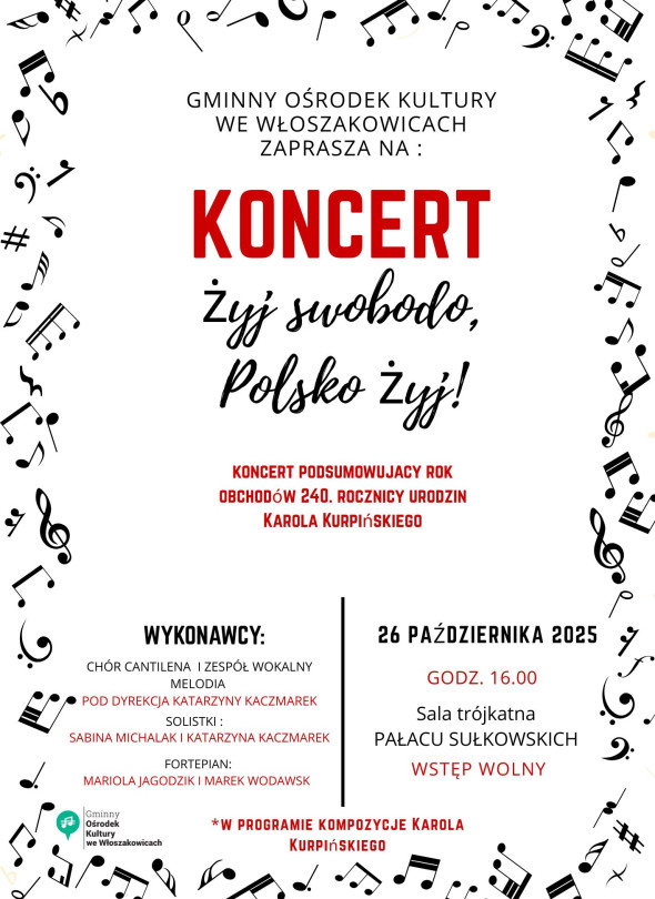 Gminny Ośrodek Kultury we Włoszakowicach serdecznie zaprasza 26 października na koncert podsumowujący rok obchodów 240. rocznicy urodzin Karola Kurpińskiego — wybitnego kompozytora i patrioty.