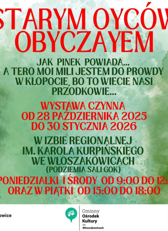 Gmina Włoszakowice od wieków tętni tradycją. Tu, w sercu regionu o bogatym folklorze, wciąż żywe są zwyczaje przekazywane z pokolenia na pokolenie – te same, które dawniej wyznaczały rytm życia i świąt. Teraz można je poznać na nowo, podczas niezwykłej wystawy „Starym Ojców Obyczajem”, przygotowanej przez Izbę Regionalną im. Karola Kurpińskiego we Włoszakowicach.