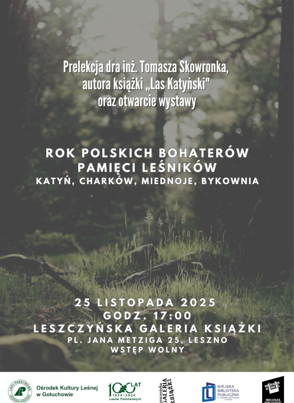 Wraz z Ośrodkiem Kultury Leśnej w Gołuchowie zapraszamy we wtorek 25 listopada 2025 o 17:00 do Leszczyńskiej Galerii Książki przy pl. Jana Metziga 25 w Lesznie na spotkanie z dr. inż. Tomaszem Skowronkiem — autorem książki „Las Katyński” — oraz na otwarcie wystawy poświęconej leśnikom zamordowanym w Katyniu, Charkowie, Miednoje i Bykowni. Wstęp wolny.