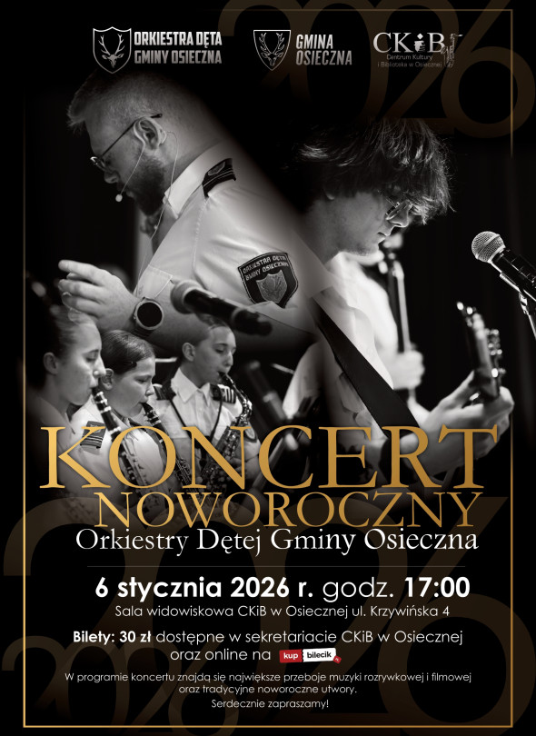 Już 6 stycznia 2026 r. o godz. 17:00 zapraszamy do sali widowiskowej CKiB w Osiecznej na koncert pełen energii, emocji i pięknych brzmień.
