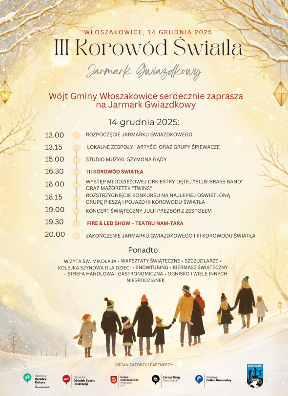Wójt Gminy Włoszakowice i Gminny Ośrodek Kultury we Włoszakowicach serdecznie zapraszają mieszkańców gminy i jej przyjaciół na III Korowód Światła i Jarmark Gwiazdkowy we Włoszakowicach, które odbędą się w niedzielę, 14 grudnia. To jedno z najbardziej magicznych wydarzeń w regionie — pełne światła, muzyki, zapachu pierników i cudów rękodzielniczych!