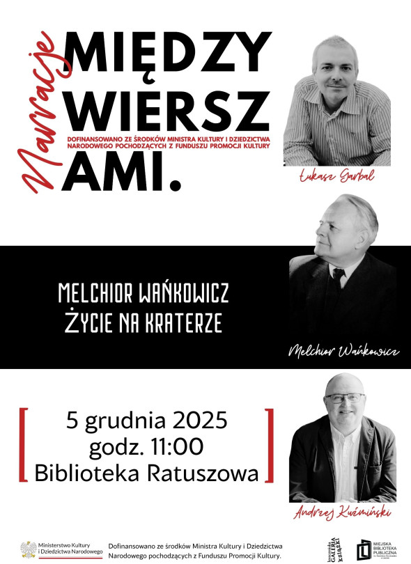 Miejska Biblioteka Publiczna w Lesznie serdecznie zaprasza na wyjątkowe spotkanie literackie w ramach projektu „Między Wierszami. Narracje”, poświęcone Melchiorowi Wańkowiczowi, o którym opowiadać będą: Łukasz Garbal , autor najnowszej, monumentalnej biografii pisarza pt. „Wańkowicz. Życie na kraterze” oraz Andrzej Kuźmiński, dyrektor Miejskiej Biblioteki Publicznej im. Stanisława Grochowiaka w Lesznie.