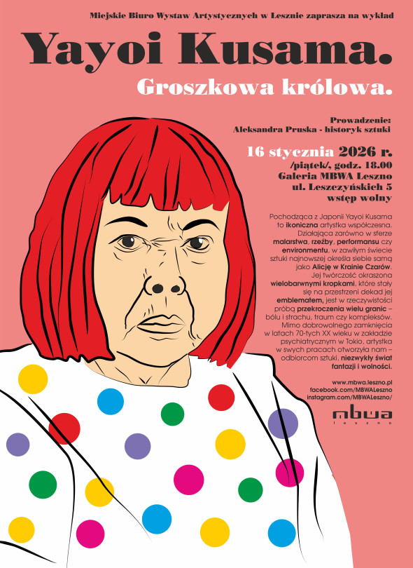 Pochodząca z Japonii Yayoi Kusama to ikoniczna artystka współczesna. Działająca zarówno w sferze malarstwa, rzeźby, performansu czy environmentu, w zawiłym świecie sztuki najnowszej określa siebie samą jako Alicję w Krainie Czarów. Jej twórczość okraszona wielobarwnymi kropkami, które stały się na przestrzeni dekad jej emblematem, jest w rzeczywistości próbą przekroczenia wielu granic – bólu i strachu, traum czy kompleksów. Mimo dobrowolnego zamknięcia w latach 70-tych XX wieku w zakładzie psychiatrycznym w Tokio, artystka w swych pracach otworzyła nam – odbiorcom sztuki, niezwykły świat fantazji i wolności.