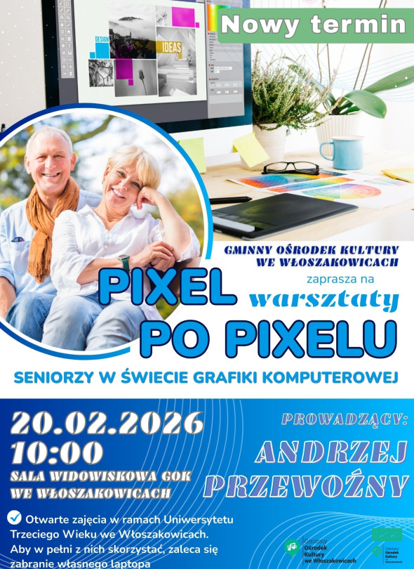 Gminny Ośrodek Kultury we Włoszakowicach serdecznie zaprasza na otwarte warsztaty grafiki komputerowej dla seniorów pod hasłem: „Piksel po pikselu. Seniorzy w świecie grafiki komputerowej”! Spotkanie odbędzie się 20 lutego o godz. 10:00 w Sali Widowiskowej GOK.