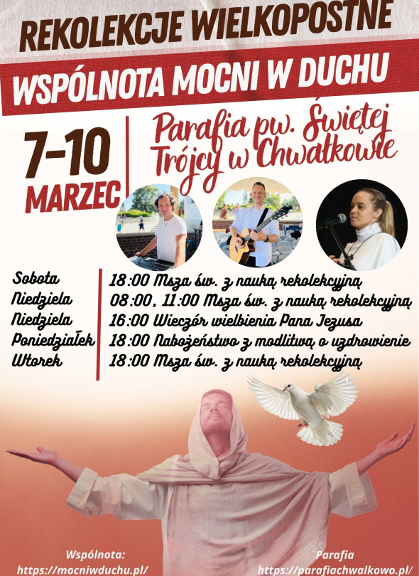W dniach 7–10 marca nasze rekolekcje poprowadzi znana w całej Polsce wspólnota Mocni w Duchu z Łodzi. To czas wypełniony wspólną modlitwą, inspirującymi naukami oraz radosnym wielbieniem.