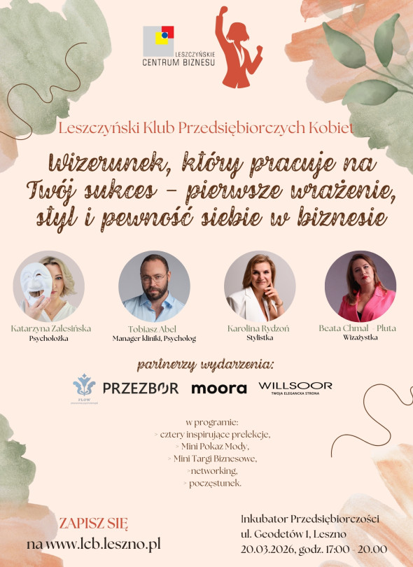 „Wizerunek, który pracuje na Twój sukces – pierwsze wrażenie, styl i pewność siebie w biznesie” to temat przewodni kolejnego spotkania Leszczyńskiego Klubu Przedsiębiorczych Kobiet. Tym razem skupimy się na wizerunku w wielu jego aspektach. Zrób sobie prezent i spędź czas w świetnym towarzystwie.