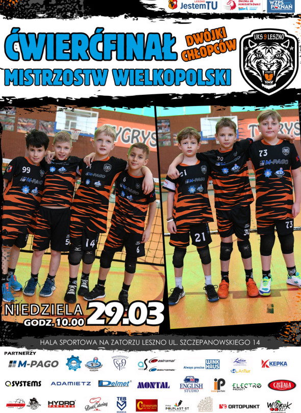 Już w niedzielę w hali SP9 na Zatorzu ćwierćfinał Mistrzostw Wielkopolski dwójek chłopców. Dwa zespoły UKS 9 Leszno powalczą o awans do półfinału. Drugi turniej odbędzie się w Kaliszu. Do dalszej części rozgrywek awansuje tylko 7 zespołów. Trzymajcie kciuki za nasze Tygrysy i zapraszamy do kibicowania.