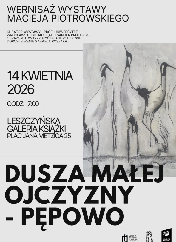Miejska Biblioteka Publiczna im. Stanisława Grochowiaka w Lesznie serdecznie zaprasza na wernisaż wystawy „Dusza Małej Ojczyzny - Pępowo” Macieja Piotrowskiego. Wydarzenie odbędzie się 14 kwietnia 2026 r., o godz. 17:00 w Leszczyńskiej Galerii Książki (Plac Jana Metziga 25). Wstęp wolny.
