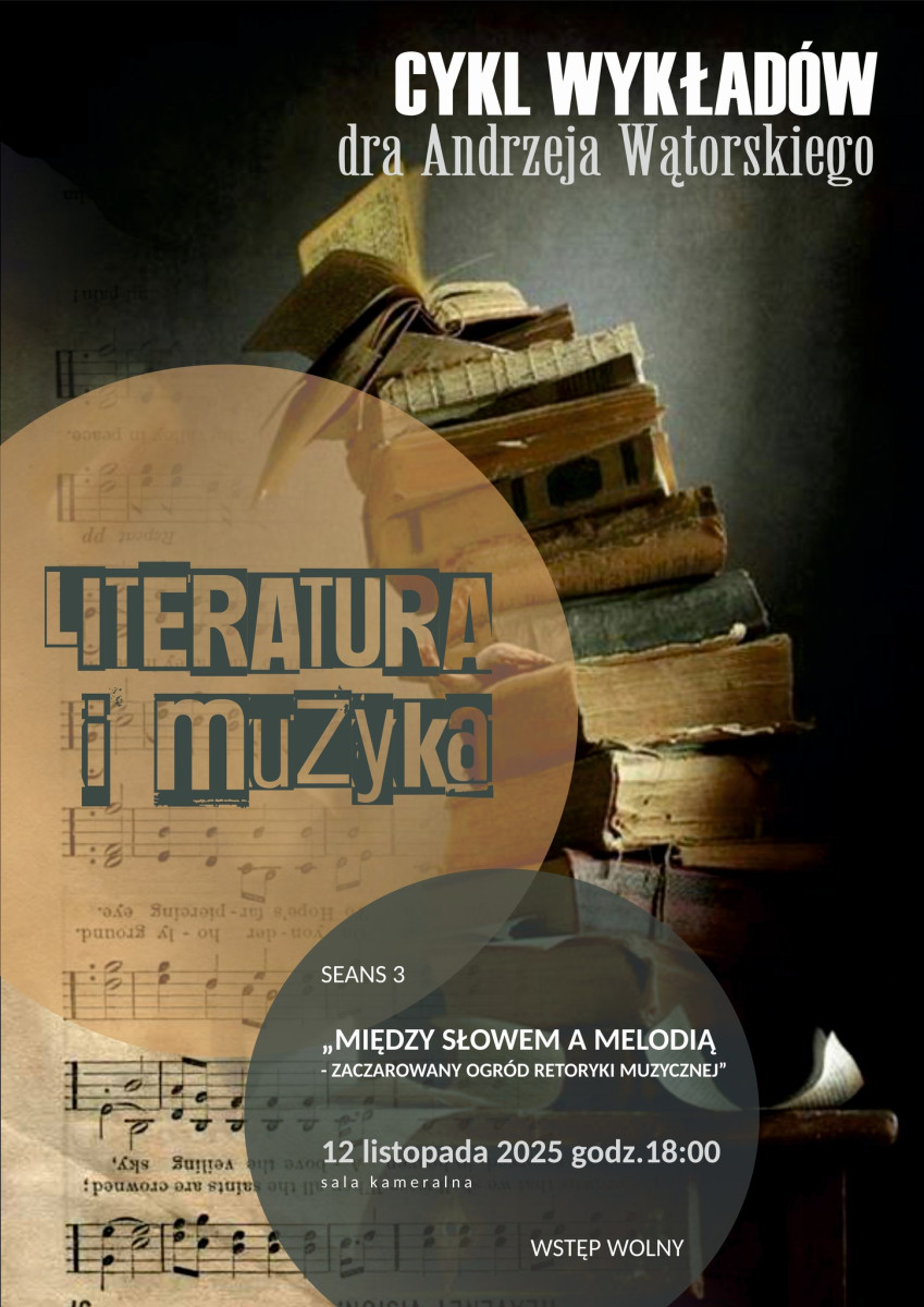 12 listopada o godz. 18 odbędzie się spotkanie: Między słowem a melodią - zaczarowany ogród retoryki muzycznej. Omówione zostaną środki muzyczne, wykorzystane w utworach wokalno -instrumentalnych ilustrujące zjawiska z tekstu literackiego (emocje, nastroje, głosy przyrody). W programie - prezentacja multimedialna, ubarwiona gawędą dr. Andrzeja Wątorskiego.