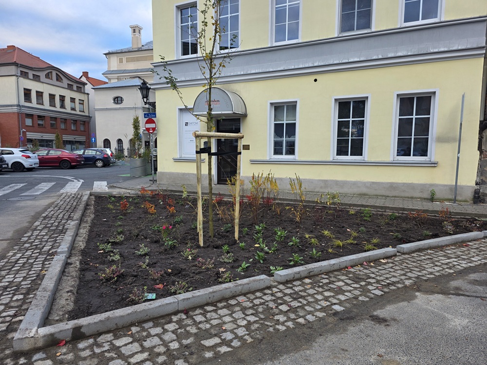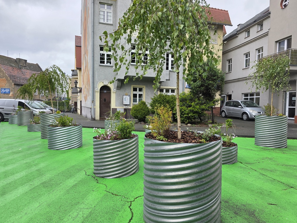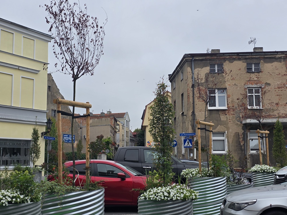 Przystąpiono do kolejnego etapu odasfaltowania placu Powstańców i jego najbliższego sąsiedztwa. Dwa fragmenty asfaltu zostały skute. W miejsca po twardej nawierzchnia nawieziono ziemi i posadzono rośliny. Drzewka tym razem są już w gruncie, nie w donicach. W ciasnej miejskiej dzielnicy powstały dwa nowe i całkiem spore skwery.