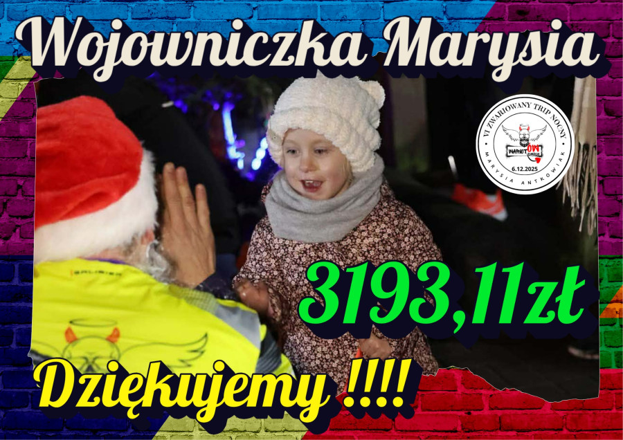 Dzięki Waszym otwartym sercom i hojności wspólnie zebraliśmy 3193,11 zł, które trafią do dzielnej Wojowniczki Marysi. Wasze wsparcie to dla niej nie tylko realna pomoc, ale także ogrom motywacji i wiary, że wokół są ludzie, którym chce się pomagać.
