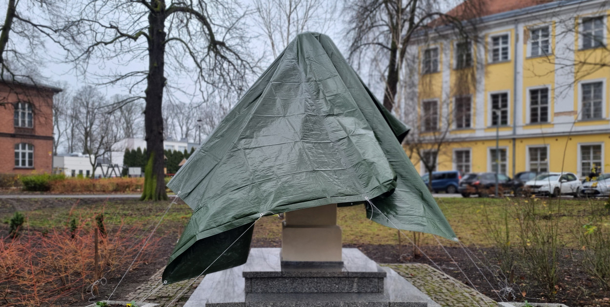 Pomnik upamiętniający Powstańców Wielkopolskich w parku przy Placu Tadeusza Kościuszki w Lesznie skrywa plandeka. To dlatego, że...