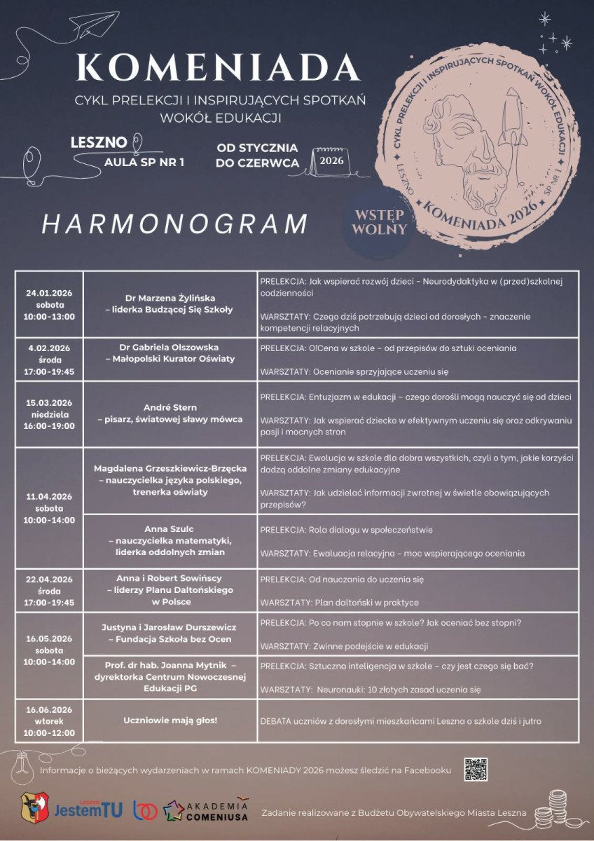 Projekt Komeniada to cykl prelekcji i warsztatów z udziałem ekspertów z Polski, wśród których będzie André Sterna, pisarz i światowej sławy mówcy, na którego wykłady przychodzą tysiące osób. Spotkania mają być interaktywne i wypełnione dyskusjami. W czerwcu projekt zakończy debata z udziałem uczniów.